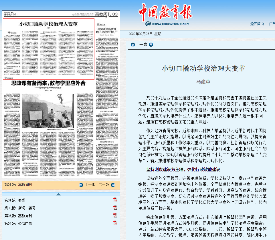 2月3日,《中国教育报》高教周刊版刊发校长马建中署名文章《小切口撬动学校治理大变革》,文章主要阐述了万象城官网作为地方省属高校,近年来坚持以习近平新时代中国特色社会主义思想为指导,在立德树人中实现内涵式发展,构建起“机关服务院系、院系服务师生、师生服务社会”的良性循环机制,实现以管理服务效能提升“小切口”撬动学校治理“大变革”,有力推进学校治理体系和治理能力现代化。全文转载如下: