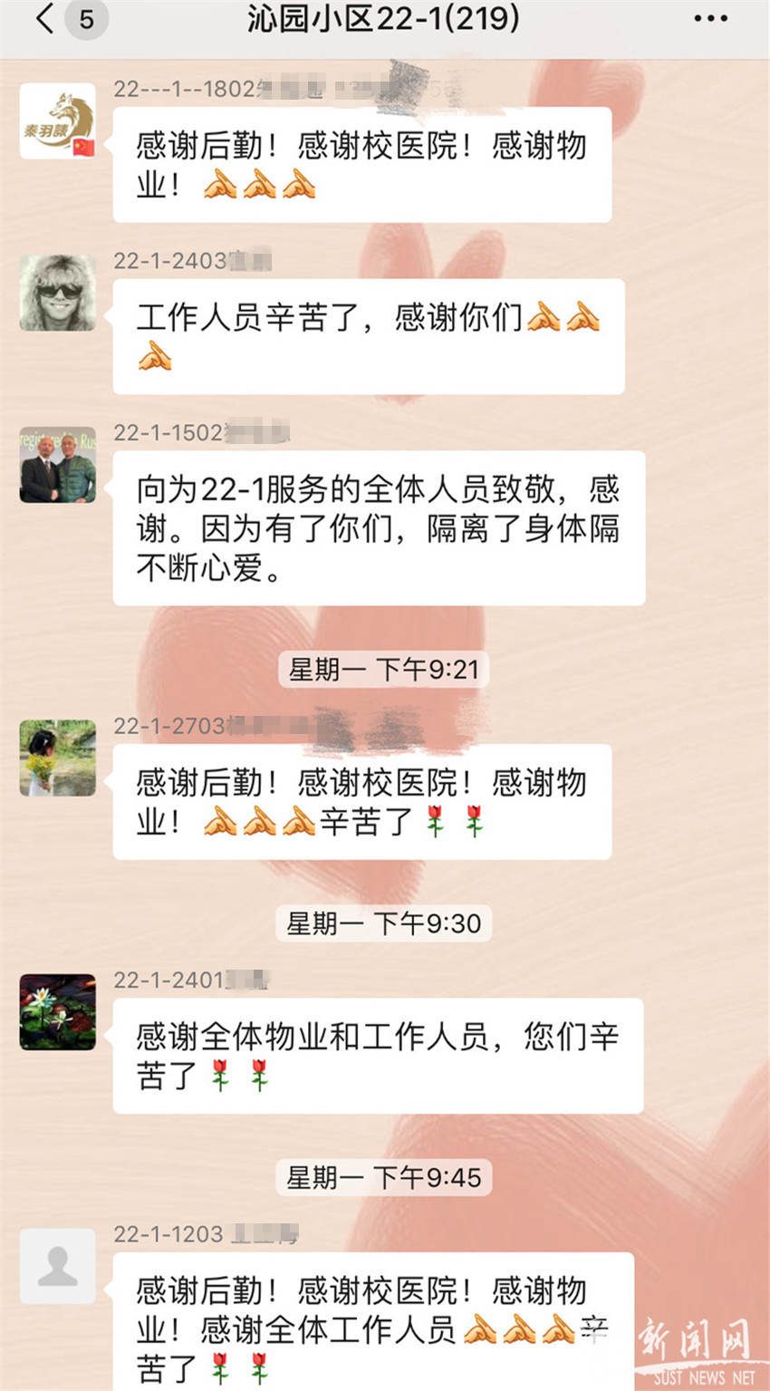 晚上21:20 隔离封闭的第一天顺利过去了,大家纷纷在群里表达着自己的感谢之情,感谢社区、感谢后勤、感谢物业、感谢校医院……说实话,有些事情我并不清楚具体是学校哪个部门负责的,我也不清楚现在究竟有多少部门、多少工作人员为了我们200多位居民全员出动、满负荷运转。但是,我知道学校守护着我们,我知道这些未曾谋面的工作人员其实比隔离在家的我们接触的人更多、面临的风险更大、也付出的更多。虽然在这场疫情之前,他们也没有类似的处理经验,但在这隔离的第一天里,每一件我所关心的事情都有人比我更关心,我的每一个需求都得到了及时有效的满足。