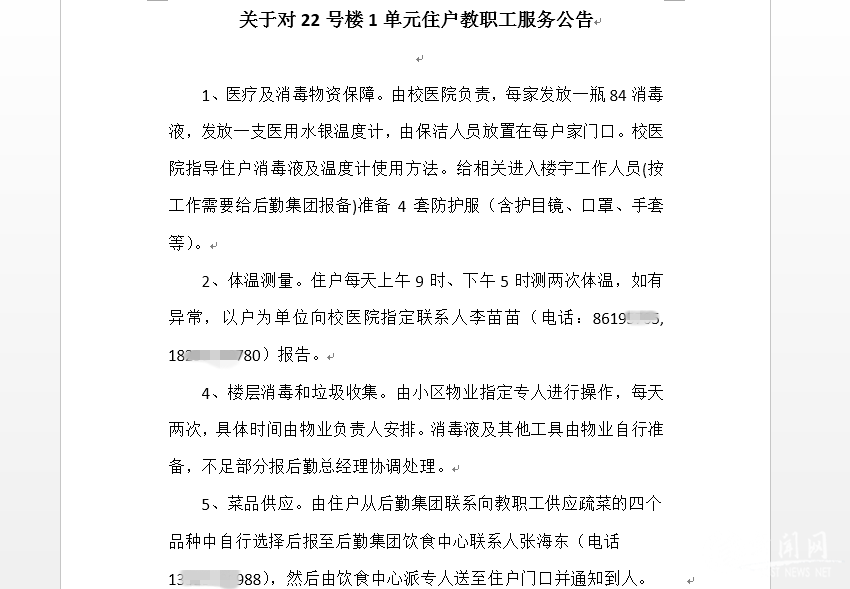 隔离范围和时限、隔离基本措施在公告中写得清清楚楚,学校的公告中还特别提出了对我们隔离区域的服务保障,学校成立了后勤保障组、现场管控组、环境消毒组等相应组织,尽最大努力保障好我们的生活物资、水电气暖、垃圾清运等生活需求,会每日给我们提供蔬菜等日常生活必需物资,同时对单元及周边范围进一步加强消毒,还公布了两位封闭管理期间联系人的手机号码。说实话,刚看到隔离封闭消息,我内心很慌,但公告中的信息打消了我所有的疑虑和顾虑。细细想想,就在我睡觉的短短几个小时内,这么多事情都有人彻夜未眠替我们考虑周全了。除了不能下楼,我内心感觉很踏实、很安全。我边把公告转发给爸妈,边往他们的卧室走,宣布这一系列的消息。