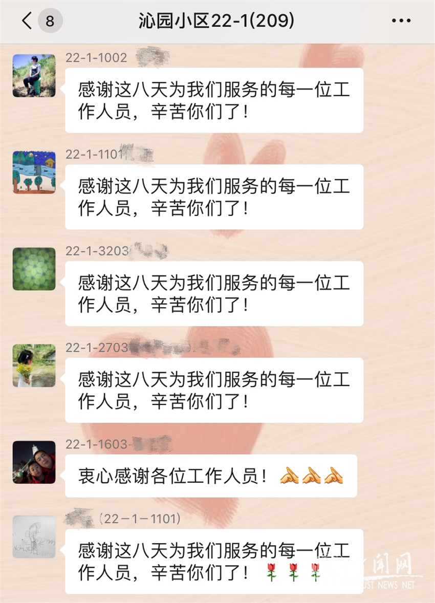 当然,解除隔离让我们终于可以自己取快递、自己买菜了,终于不用再给那些为我们日夜奔忙的工作人员继续添麻烦了。“感谢为我们服务的每一位工作人员,辛苦你们了!”大家用整齐的感谢话语刷满了我们22号楼1单元的居民微信群。