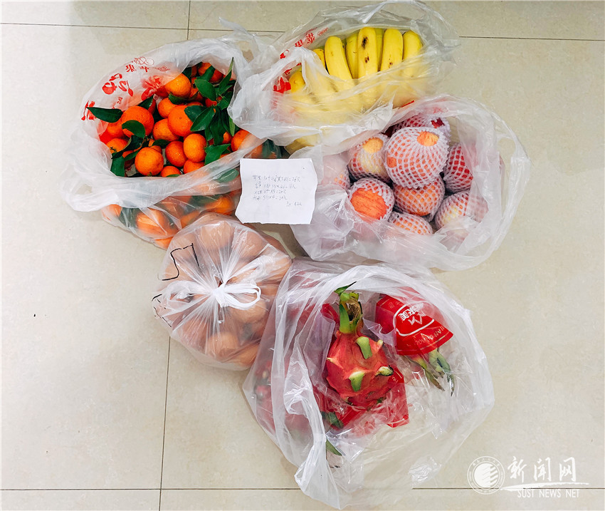 上午11:00 突然传来的敲门声打破了家里的安静,老公赶紧跑去开门,我坐在沙发上回头一看是个身着防护服的“蒙面大侠”,双手提满了东西。我心想,难道是我们刚和后勤集团订的鸡蛋,这送来的也太快了吧,再说5斤鸡蛋也不至于装这么多袋子吧。东西拿进家,我仔细一看,还有苹果、香蕉、火龙果和桔子。老公说,他和负责给我们隔离单元供应菜品的张海东老师联系买鸡蛋的时候,告诉张老师家里有孕妇,看能不能顺便再帮忙买点水果。没想到一个人负责为整个隔离单元配送蔬菜的他,给我们带来了这么新鲜、丰富的水果。