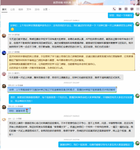 全新的教学模式对大多数高校教师来说都是第一次经历,难免有些环节做的不到位或者没有考虑周全。大部分老师还是在家中完成备课、直播、辅导等工作,针对在线课程面对面的交流探讨较少。我们几位老师每次课后都会在QQ群中一起分享经验和心得:“我开启了‘举手’功能学生们不积极发言怎么办?”“我怎么确定学生在认真听课啊?”“腾讯课堂生成的考勤记录很不错,可以看到学生们的学习时长。”通过这样不断的交流,快速解决问题,并相互间取长补短,继而提升在线教学的教学质量。