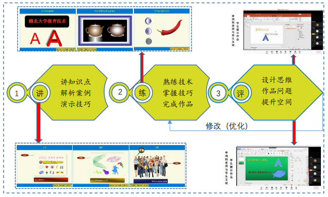 我的这门课属于专业课,课程特点在于理论和实践的结合,要求学生既要掌握基本知识,也要掌握相应的技术技能。所以我采用“讲-练-评”三结合的基本思路开展教学。“讲”就是解析关键知识点,分析典型案例,演示基本技术操作,使得学生对所学知识点和基本技能有所掌握;“练”就是要让学生把掌握的知识点内化,变成自己的技能,练习制作作品,在模拟老师演示作品的基础上实现自己的创新,做出属于自己原创性的作品;“评”就是对学生的作品要有评价过程,要有对比过程,指出学生作品中存在的问题,并提出具体解决办法,指导学生解决问题,优化作品。