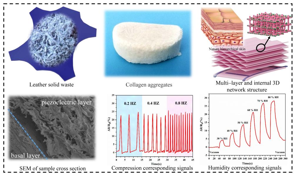 针对现有柔性传感材料存在的价格昂贵、不可降解、耐久性和生物相容性难以共存等问题,王学川等人采用层级可控降解技术从含铬废弃皮革中提取胶原聚集体,并以其为柔性材料制备出了一种新型成本低、性能高、环境友好、功能多的柔性传感器。天然皮胶原聚集体的生物相容性极佳,通过结构设计以及材料改性,可极大增加胶原基传感器的耐用性。该多功能柔性传感器具有多维识别能力、快速响应和宽动态响应范围,且对湿度具备优良的响应性能,响应时间相对传统的湿度传感器较短,加之其成本低、性能高、环境友好、多功能等优势,在实时健康监控、生物医学和智能机器人领域具备广阔的前景。