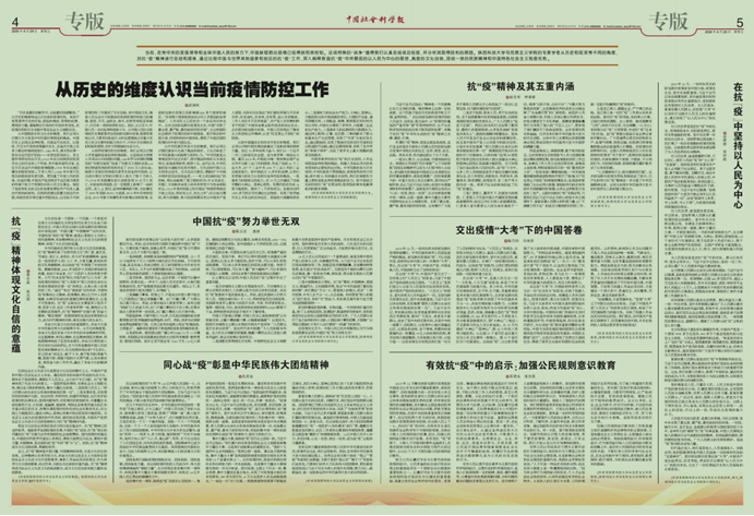4月29日,《中国社会科学报》专版刊发万象城官网马克思主义学院教师一组“学理战疫”理论文章,分别是:陈巧玲教授撰写的《交出疫情“大考”下的中国答卷》、李长真教授撰写的《抗“疫”精神体现文化自信的意蕴》、吴明永教授撰写的《有效抗“疫”中的启示:加强公民规则意识教育》、阮云志教授撰写的《中国抗“疫”努力举世无双》、武端利副教授撰写的《从历史的维度认识当前疫情防控工作》、赵宝军副教授撰写的《“抗疫精神”及其五重内涵》、岳婷婷撰写的《在抗“疫”中坚持以人民为中心》和孔庆金撰写的《同心战“疫”彰显中华民族伟大团结精神》。八篇文章聚焦抗疫精神凝练、人民群众主体力量发挥、中国特色社会主义制度优越性、文化自信、民族精神、社会治理等方面,从历史、现实和国际比较等不同视角深入进行理论阐释,努力讲好中国人民万众一心、众志成城的战“疫”故事。
