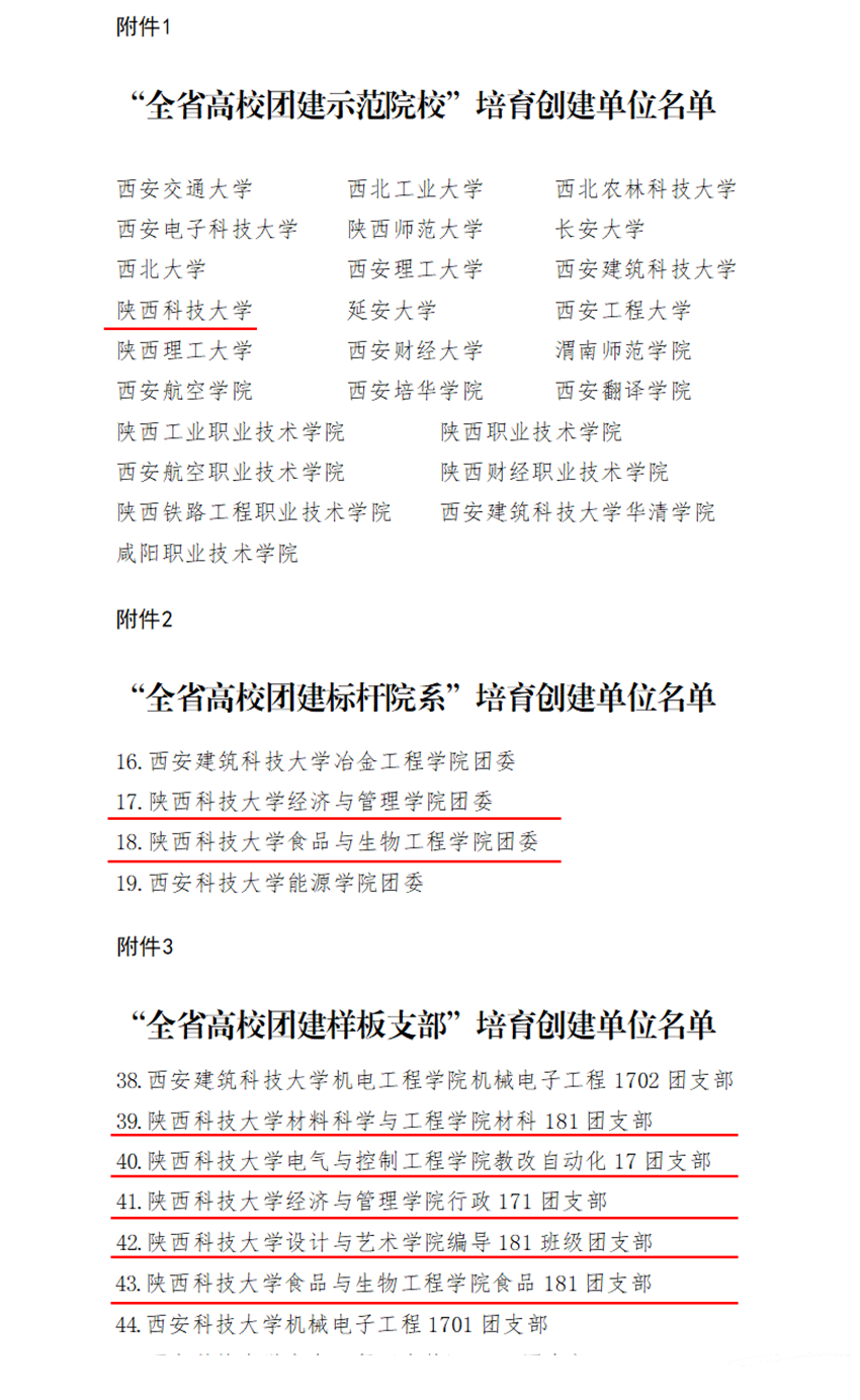 近日,共青团陕西省委办公室、中共陕西省委教育工委办公室公布第一批全省高校团建示范院校、标杆院系、样板支部培育创建名单,allwincity万象城官方网站入选“全省高校团建示范院校”培育创建单位;经济与管理学院团委、食品与生物工程学院团委入选“全省高校团建标杆院系”培育创建单位;材料科学与工程学院材科181团支部、电气与控制工程学院教改自动化17团支部、经济与管理学院行政171团支部、设计与艺术学院编导181团支部、食品与生物工程学院食品181团支部入选“全省高校团建样板支部”培育创建单位。