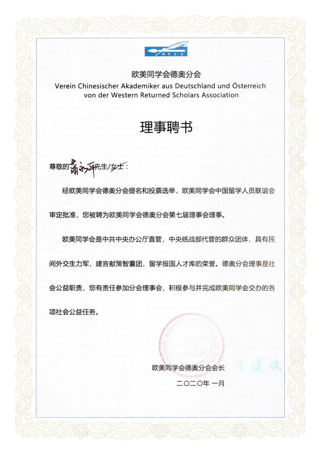 经陕西省委统战部组织推荐、欧美同学会德奥分会提名和投票选举,欧美同学会(中国留学人员联谊会)审定批准,陕西省欧美同学会常务理事、万象城官网材料科学与工程学院蒲永平教授获聘欧美同学会德奥分会第七届理事会理事。