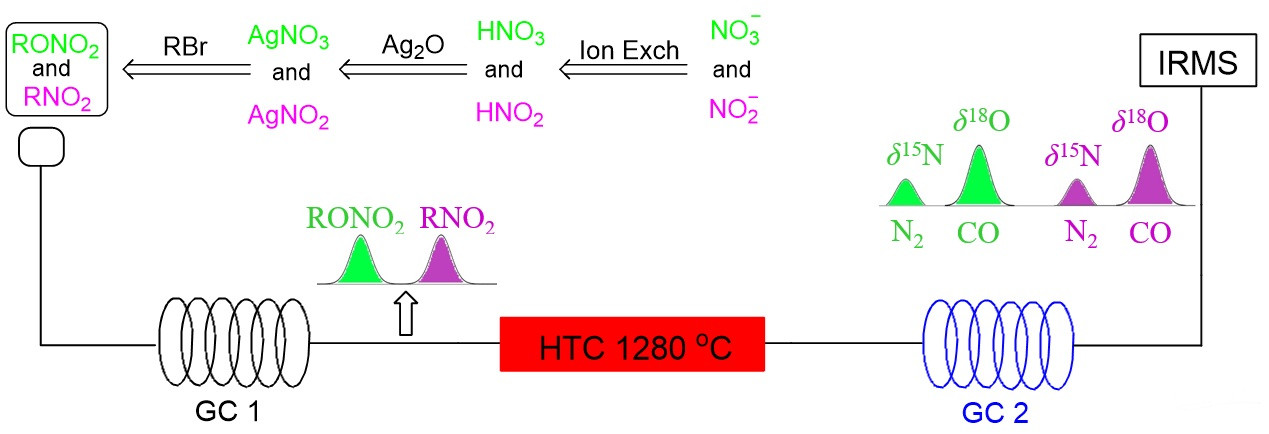 针对上述方法存在的问题,ICB团队创新性地将无机硝酸盐和亚硝酸盐,以无同位素交换、丢失和获得的方式,几乎定量地转化为有机物(硝酸酯和硝基烷烃),并充分利用气相色谱(GC)的分离功能,在气相/热解/气相/同位素比质谱(GC/Pyrolysis/GC/IRMS)联用仪上成功实现了同时分析硝酸盐和亚硝酸盐的δ18O和δ15N(见下图)。该方法灵敏度高、操作简单、适用于各种类型样品;同时,有望实现样品分析的自动化。