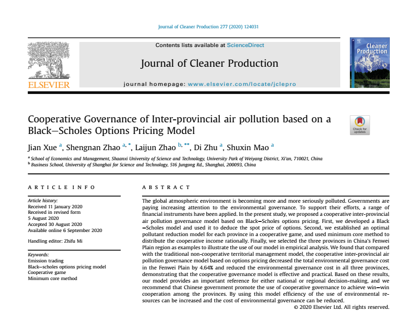 “Cooperative Governance of Inter-provincial air pollution based on a Black–ScholesOptions Pricing Model”以近年来大气污染治理为背景,提出了基于Black–Schole期权定价的省际合作大气污染治理模型,将金融期权衍生工具运用到环境治理中,探索最优的治污模式,运用最小核心法对区域大气污染合作治理收益进行分配。研究结果表明:该模型可以提高环境资源的利用效率,降低环境治理成本,实现合作省份共赢,对社会和环境可持续发展具有重要的理论参考价值。全文链接:https://doi.org/10.1016/j.jclepro.2020.124031