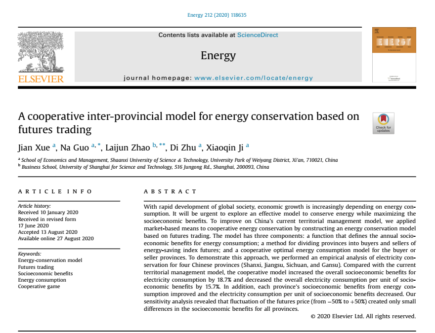 “A cooperative inter-provincial model for energy conservation based on futures trading”以全球市场化的节能模式及我国现行属地节能管理模式为背景,提出了基于期货交易的省际合作节能模型,将金融期货衍生工具应用在节能管理中,探究最优节能管理模式,并采用Shapley值法对合作收益进行分配。研究结果表明:与现行属地节能管理模式相比,该模型提高了合作省份整体以及各省份的社会能源收益,降低了单位社会能源收益用能量,并且有效提高各省份参与节能积极性,对节能管理和经济、社会可持续发展具有重要理论参考价值。全文链接:https://doi.org/10.1016/j.energy.2020.118635