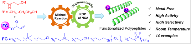 聚肽也称聚氨基酸,是一类以多肽为主链的具有二级结构的高附加值生物材料。人工合成聚肽是天然蛋白质结构与功能关系研究的绝佳模型,其独特的生物相容性、可降解性及响应性使其在生物医学和组织工程学领域展现出广阔的应用前景。2019年针对人工合成聚肽制备周期长,副反应多且分子微观结构无法精密调控的研究现状,赵伟副教授受自然界广泛存在的“多重协同氢键”作用启发,成功开发出兼具高活性和高选择性的有机氟醇小分子催化体系,首次实现了人工聚肽绿色高效催化合成路线的突破。相关研究成果以“Fast and selective organocatalytic ring-opening polymerization by fluorinated alcohol without a cocatalyst”为题在国际顶级学术期刊《Nature Communications》上发表并被选为亮点文章(万象城官网为唯一通讯单位和第一作者单位),系万象城官网研究工作在Nature系列期刊的首次报道。时隔一年,经过不懈努力,研究小组在前期工作的基础上巧妙地将高效的迈克尔加成反应与无金属催化聚合反应相结合,首次开发出一种高效实现人工合成聚肽功能化的新方法,该方法不仅可实现人工合成聚肽的定点功能化,而且可实现功能化聚肽微观分子结构的精密调控,为专注于聚肽功能研究而非聚肽合成的科研工作者提供了一种获得精密功能聚肽的绿色高效的普适性方法。研究成果近期发表在国际化学领域顶级学术期刊《Angew. Chem. Int. Ed.》上。
