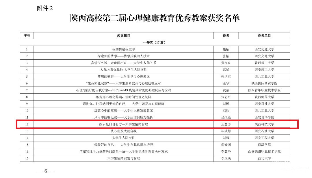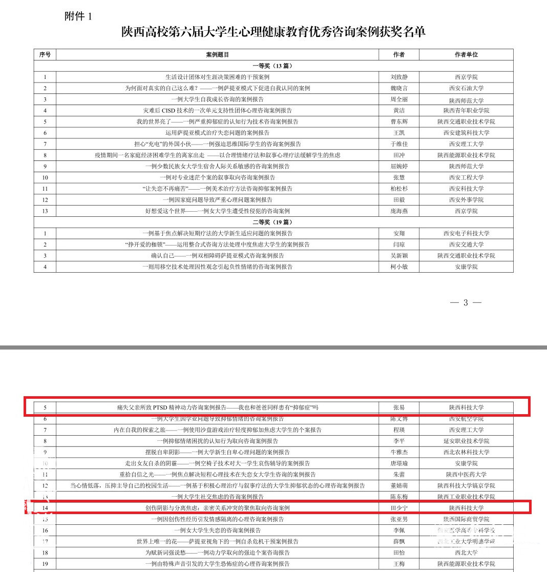 10月28日和29日,省委教育工委下发了关于陕西高校第五届“阳光护航”心理育人宣传季省级有关活动获奖情况的通报。心理中心教师王慧芳作品《拨云见日自有方—大学生情绪管理》荣获陕西高校第二届心理健康教育优秀教案一等奖,电气与控制工程学院辅导员任欢作品《爱的语言》荣获陕西高校第二届心理健康教育优秀教案三等奖。心理中心教师张易案例《痛失父亲所致PTSD精神动力咨询案例报告——我也和爸爸同样患有“抑郁症”吗?》、材料科学与工程学院党委副书记田少宁案例《创伤阴影与分离焦虑:亲密关系冲突的聚焦取向咨询案例》荣获陕西高校第六届大学生心理健康教育优秀咨询案例二等奖。电气与控制工程学院学生杨康《意义》、食品与生物工程学院学生宋雨《成人成己》在陕西高校大学生“心相遇 爱同行——心理健康教育伴我成长”主题征文活动中荣获三等奖,电气与控制工程学院辅导员任欢、食品与生物工程学院辅导员韩晔荣获优秀指导教师称号。
