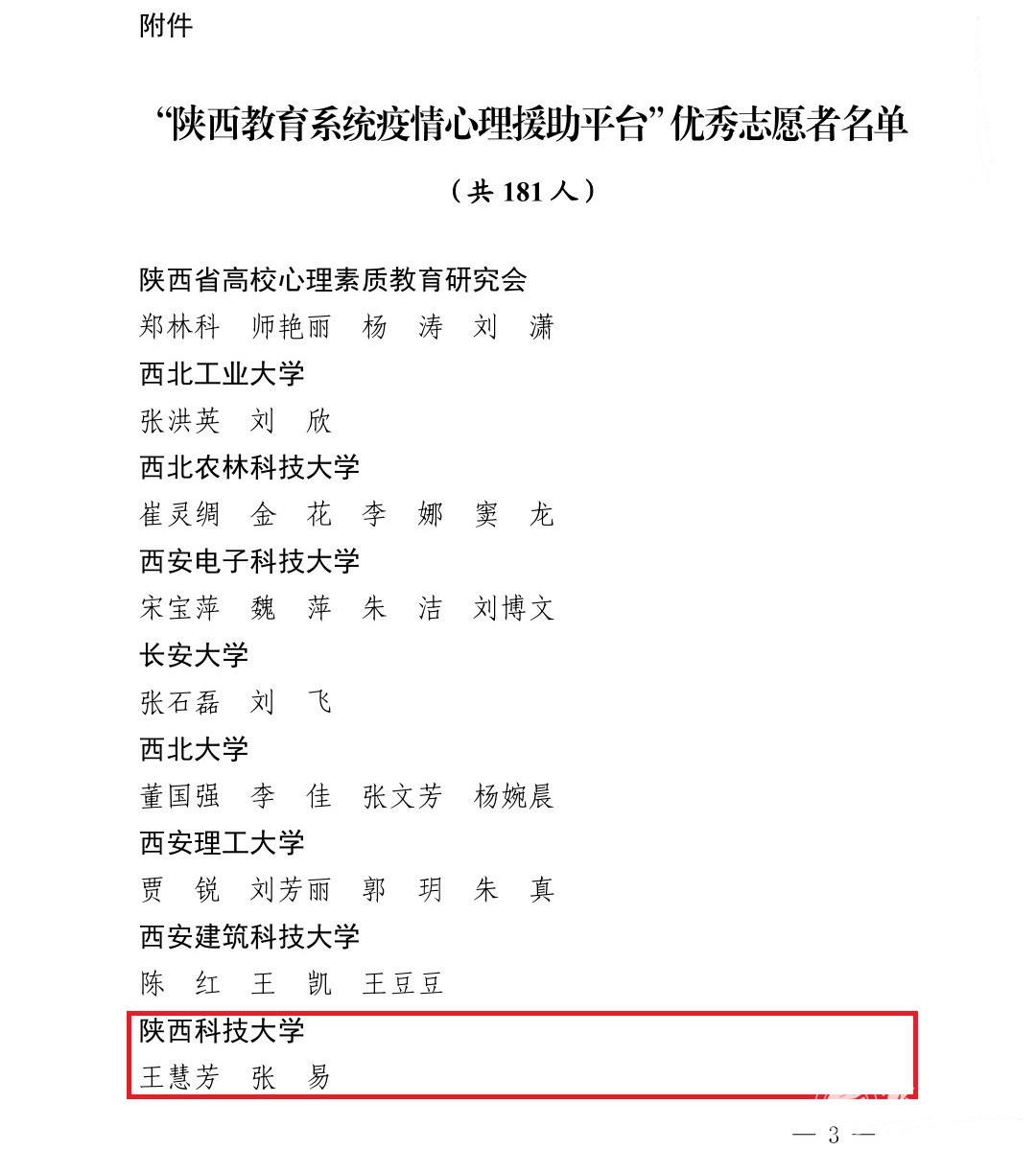 10月28日,陕西省委教育工委对参与疫情期间心理援助志愿服务工作的志愿者进行了通报表彰。校心理健康教育中心教师王慧芳和张易积极参与“陕西教育系统疫情心理援助志愿者工作”,面向全省师生和人民群众开展疫情相关的心理援助热线和网络支持工作,被陕西省委教育工委评为“陕西教育系统疫情心理援助平台”优秀志愿者。