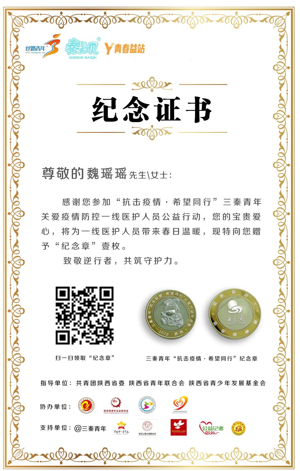抗击新冠疫情期间,魏瑶瑶又和他所在的青年先锋联合工作组,马不停蹄地联系了咸阳一家苹果企业,为武汉等地医疗机构捐赠苹果4.5吨。这些爱心苹果顺利抵达武汉火神山医院、第九医院和西安国际交流医疗中心等抗击疫情一线医护人员手中,为可敬可爱的白衣天使们送上一份问候与鼓励。