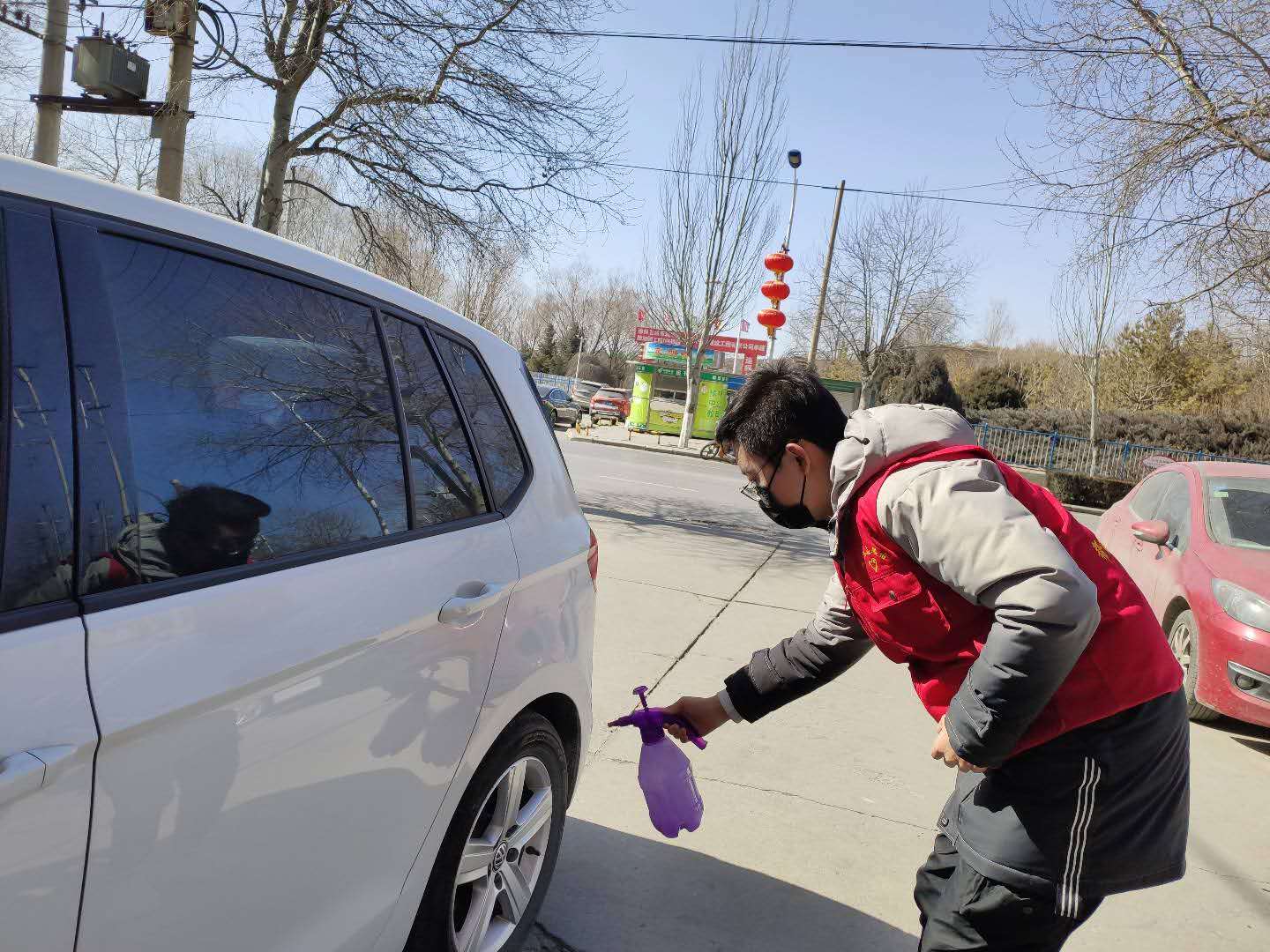 进出小区的车辆消毒也遇到了同样的麻烦,尽管魏瑶瑶总会提前用水和消毒原液按比例勾兑称成消毒液准备好,但是由于低温消毒液经常被冻住。他还是用“笨”法子——把消毒液放在离工作站点几十米远的有暖气的屋子里,一旦有车辆经过,他就飞快地跑到屋子里去拿消毒液,消毒完后再快速把消毒液放回。数九寒天中,露天工作的他却常常是红着脸、冒着汗。