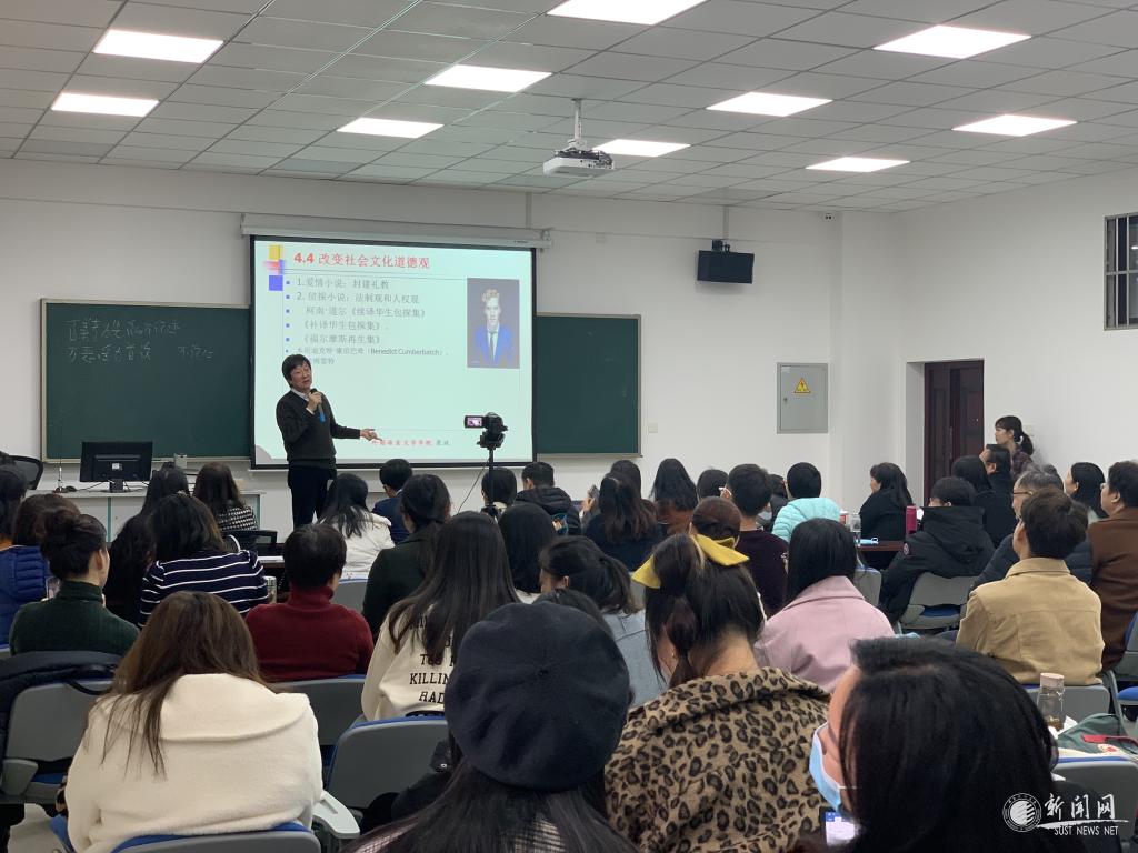 张政教授以《翻译文化史漫谈》为题,梳理了中国翻译文化史的六个重要阶段,为在座师生搭建了一个有趣易懂的翻译文化史框架。张教授主要围绕佛经翻译和清末明初的西学翻译,引经据典,阐释了翻译与文化之间的碰撞与交融,阐明了博大精深的中国文化富有正向价值这一重要特点,深化了师生们对翻译在妇女解放、科幻小说、白话文运动等社会诸多方面的影响和意义的理解。整场报告事例众多且鲜活,诗意盎然且生动幽默,引人入胜,激人上进。