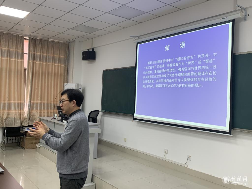 秦明利教授以希腊神话人物Hermes的图片引题,围绕六个维度,阐述了自己梳理并构建以理解和阐释为向度的斯坦纳翻译存在理论的过程,展示了自己的独特研究路径——聚焦某一重要人物,阅读文献,提炼思想,成题出文。秦教授认为斯坦纳的“理解即翻译”命题具有存在论意义,翻译是对存在的澄明。秦教授还强调,持续更新和深化的存在经验使得翻译具有不可完成性。秦教授的学术报告富有哲思,逻辑清晰,论证严密,引人深思,为参会师生扩展了研究思路,反响热烈。