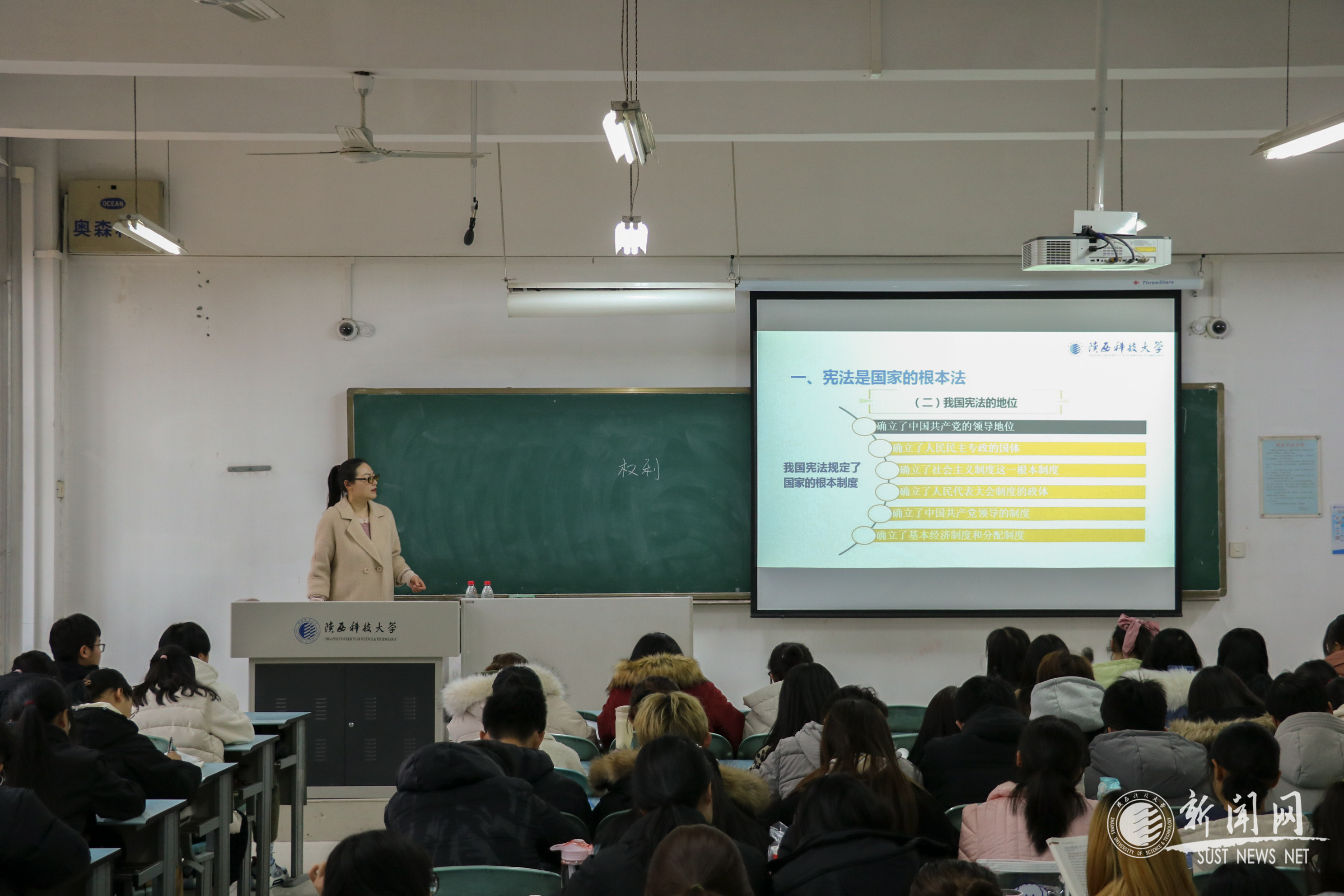 为引导学生牢固树立宪法法律至上、法律面前人人平等的法治理念,12月3日16:00,在一号教学楼F座104教师,工设201-2、服装201-2,4个班108名学生接受了一堂宪法知识宣传教育。通过教师的讲解和PPT的播放,学生们进一步了解了宪法的发展历史,知晓了我国的国体和政体,明确了公民的权利和义务,树立了学法、知法、守法、护法的意识。授课教师郭姗姗表示,“学生们不仅要增强权利观念,依法行使权利,而且要增强义务观念,依法履行义务。”