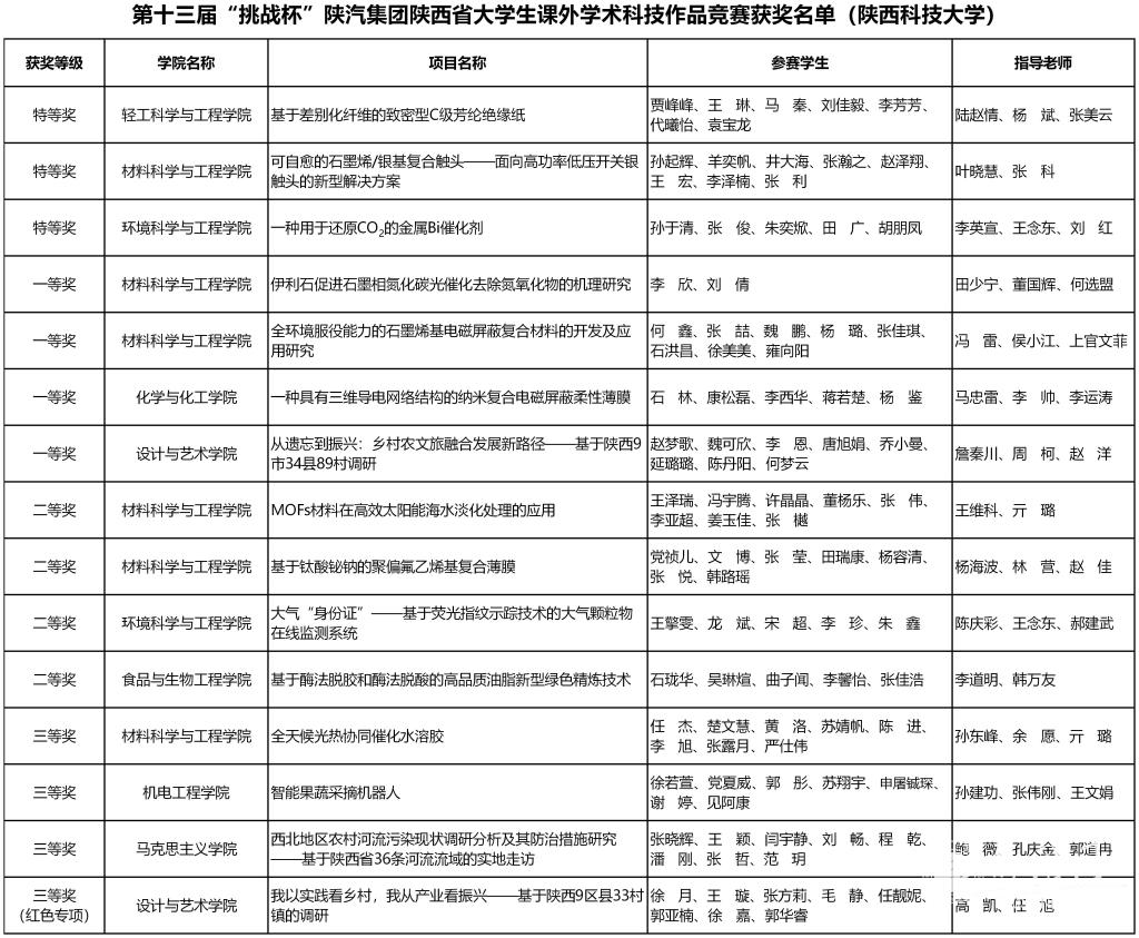 其中,轻工科学与工程学院《基于差别化纤维的致密型C级芳纶绝缘纸》、材料科学与工程学院《可自愈的石墨烯/银基复合触头——面向高功率低压开关银触头的新型解决方案》、环境科学与工程学院《一种用于还原CO2的金属Bi催化剂》3件作品荣获特等奖;化学与化工学院《一种具有三维导电网络结构的纳米复合电磁屏蔽柔性薄膜》、设计与艺术学院《从遗忘到振兴:乡村农文旅融合发展新路径——基于陕西9市34县89村调研》等4件作品获得一等奖;食品与生物工程学院《基于酶法脱胶和酶法脱酸的高品质油脂新型绿色精炼技术》、材料科学与工程学院《伊利石促进石墨相氮化碳光催化去除氮氧化物的机理研究》等4件作品获得二等奖;机电工程学院《智能果蔬采摘机器人》、马克思主义学院《西北地区农村河流污染现状调研分析及其防治措施研究——基于陕西省36条河流流域的实地走访》等4件作品获得三等奖。