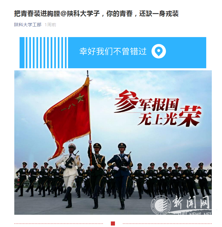 线上,在学工部公众号上发布征兵宣传推文,激励学子穿上一身戎装,同时结合校园广播进行宣传动员,确保每名学生能看到、听到国家对于入伍大学生各方面的支持和鼓励。通过微信建立学院征兵工作联系群,适时推送最新政策给所有学生。利用QQ建立了陕科大征兵意向群、报名群、预征对象群,针对不同人群进行答疑,通知各个阶段相关事项,层层推进征兵工作。