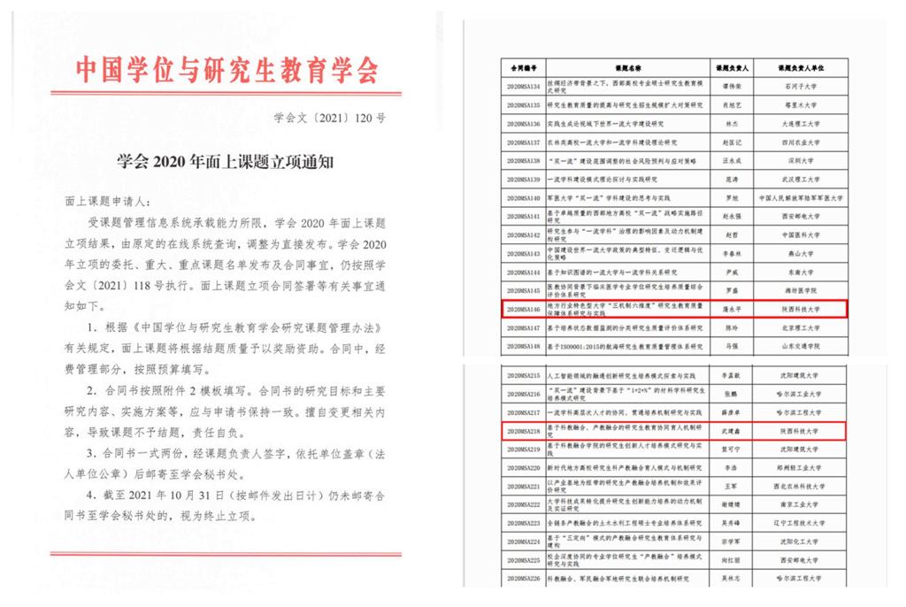 近日,中国学位与研究生教育学会公布了2020年面上课题立项结果,万象城官网材料科学与工程学院蒲永平教授申报的《地方行业特色型大学“三机制六维度”研究生教育质量保障体系研究与实践》、教育学院武建鑫副教授申报的《基于科教融合、产教融合的研究生教育协同育人机制研究》2个项目获批立项,这是万象城官网首次获得中国学位与研究生教育学会研究课题立项,立项数量在陕西省属高校中位列第三。