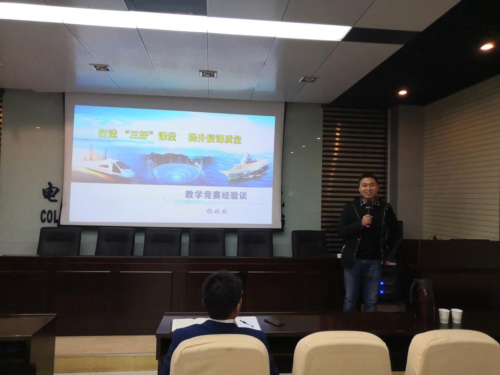 杨欢欢副教授首先为电智学院全体教师作《打造“三好”课堂,提升教学质量——教学竞赛经验谈》专题讲座。杨欢欢结合个人参加全国高校电子信息类专业青年教师授课竞赛的经验,从教学理念确立、教学环节设计、教学技能和方法在竞赛现场的发挥等方面对青年教师如何夯实教学基本功,准备教学竞赛各个环节做了深入讲解,对教学竞赛教案、课堂讲解、提问、导入、演示、板书、结束等课堂教学环节作了详细说明。他指出,教学设计是讲好一堂课的基础,要始终贯彻“好思路、好方法、好应用”的理念,根据教学大纲和教学对象的特点,合理有效地运用各种教学资源,引导学生去思考和创新,呈现高效质佳的课堂教学。
