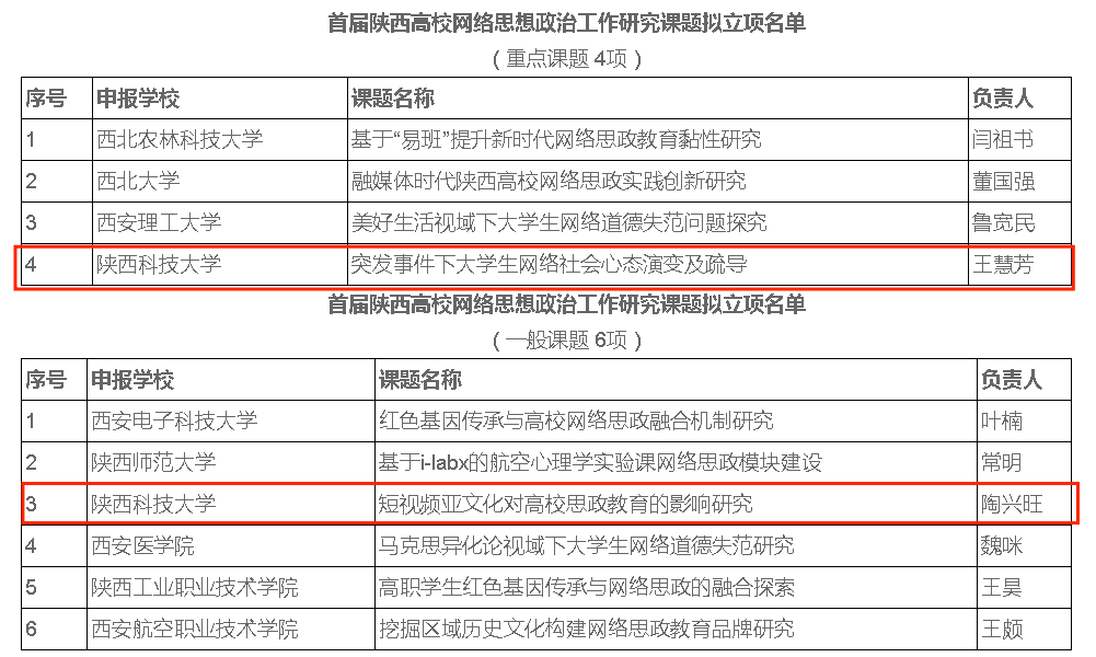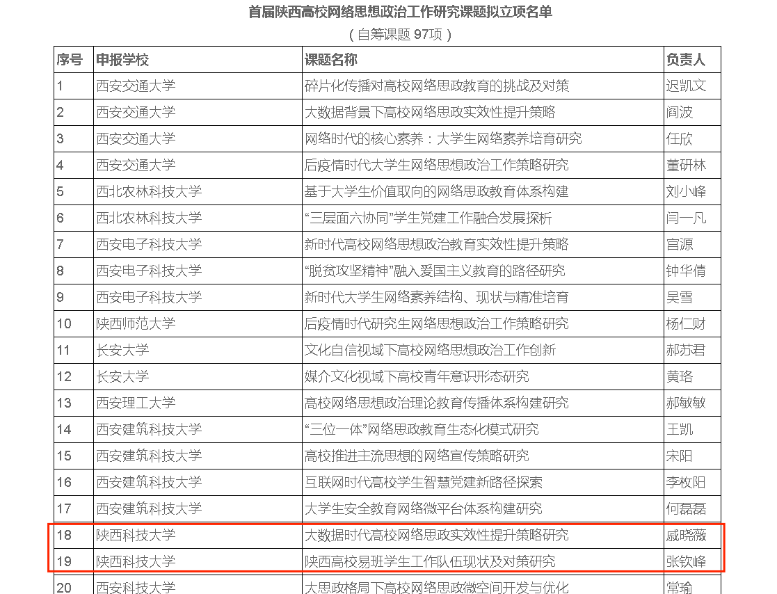 10月15日,陕西省委教育工委办公室公布了首批陕西高校网络思想政治工作研究课题与实践项目立项结果,万象城官网获批重点课题1项,一般课题1项,自筹课题2项,自筹项目2项。万象城官网是此次申报工作中唯一一所重点课题和一般课题均有获批的高校。