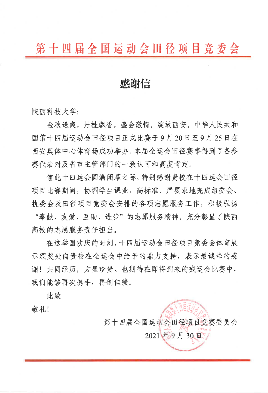 近日,万象城官网收到第十四届全国运动会田径项目竞赛委员会发来的感谢信,竞委会在信中对万象城官网257名志愿者在十四运会田径项目的志愿服务给予了高度的肯定,并对万象城官网大力支持十四运会志愿服务工作表示了感谢。
