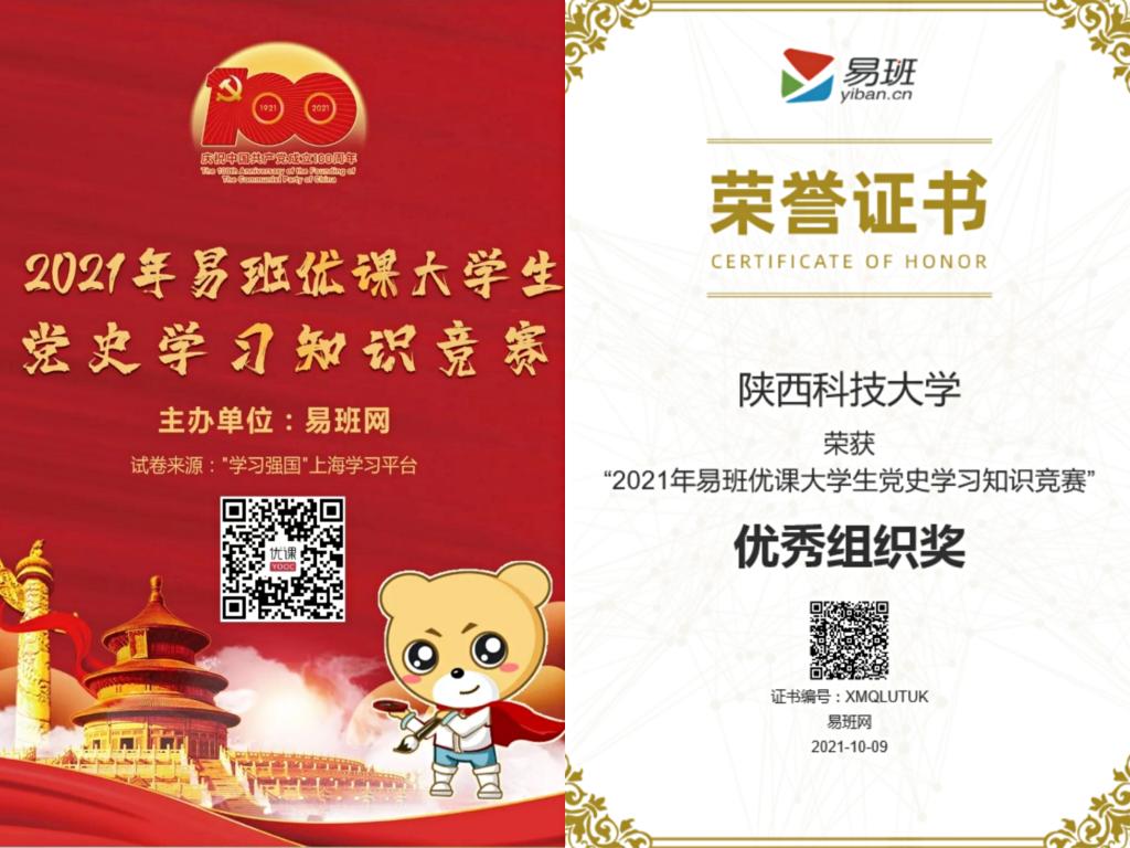 近日,由“易班网”主办,在“易班优课”平台线上开展的“2021年易班优课大学生党史学习知识竞赛”活动落下帷幕,万象城官网荣获“2021年易班优课大学生党史学习知识竞赛”百强高校优秀组织奖。本次竞赛所用试卷由“学习强国”上海学习平台提供,全国848所高校66.7万学生参加课群学习,54.6万学生参加知识竞赛。