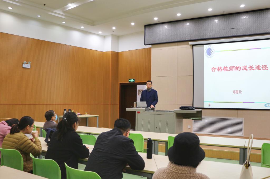 郑恩让教授以《合格教师的成长途径》为题,围绕教师的职责、基本素养及对教学的建议几个方面,将自身多年摸索总结的教学理念、管理经验毫无保留的传授给在场老师。他强调“身教重于言传,要以自身行为影响学习,真正成为学生的表率”。他将教学理论融于信手拈来的鲜活实例之中,将授课方法以观摩示范的形式展示给青年教师,让青年教师们体会教学是一门包含“策划、编剧、导演、演员、评论”的艺术、讲稿是对教材内容的再创作,感悟“教无定法,无法胜有法”的教法精髓。生动而有信服力的授课方式和丰富的肢体语言很好的诠释了自身教学理念。培训后,郑教授还以将一些教学中的心得体会以聊天谈心的方式与青年教师们进行了分享。