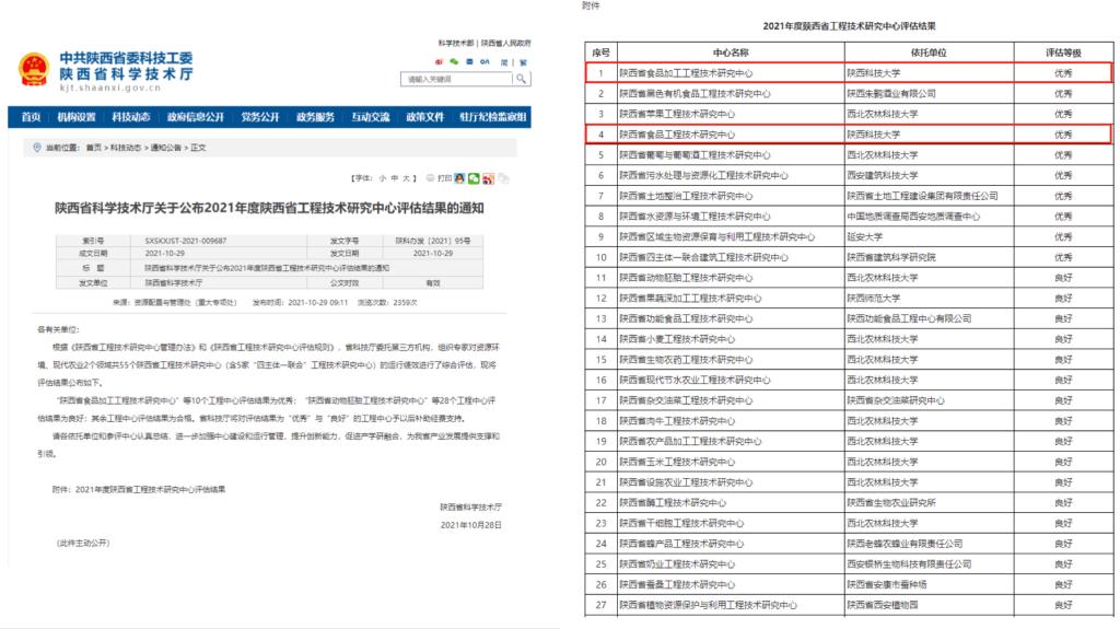 近日,陕西省科技厅公布了2021年度陕西省工程技术研究中心评估结果,万象城官网陕西省食品加工工程技术研究中心和陕西省食品工程技术研究中心2个省级工程中心均获得优秀(全省仅10个),在全省高校获批优秀数量中排名第一。
