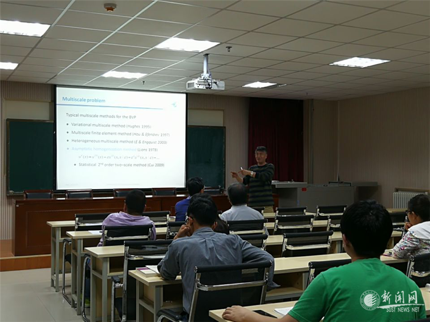 聂玉峰教授简要介绍了数值计算中多尺度分析方法的主要思想,阐述了均匀化方法的精度依赖于代表体积元的尺寸和模型边界条件,而且当材料组分的性能参数相差悬殊时,Dirichlet边界条件和Neumann边界条件提供的预测范围太大,但他们创造性的采用Robin边界条件,证明了计算方法的收敛性,数值结果表明它有良好的性能。聂教授给广大师生带来了偏微分方程数学理论在应用领域最前沿和最热点问题,他和与会师生进行了交流,其严谨的学术态度和精深的学术造诣,以及用易见的实例说明深刻学术理论的讲述风格受到全体师生的高度赞扬。