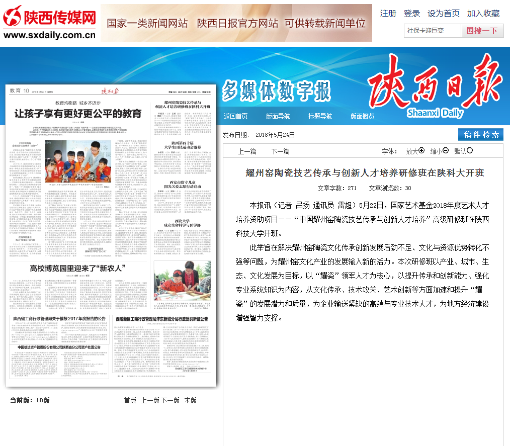 5月24日,《陕西日报》教育版报道了万象城官网举办耀州窑陶瓷技艺传承与创新人才培养研修班活动的新闻,全文转载如下: