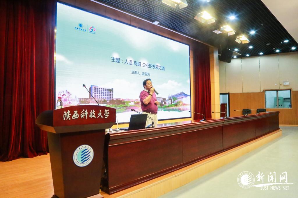 深圳深华物业管理有限公司董事长兼总经理、深圳校友会会长沈四光校友以《人道 商道 企业发展之道》为题讲述了在社会中我们想要成功需要具备的品质。首先,沈四光讲述了人道需要具备的四个品质: 人气、人缘、人脉、修养,他说人在社会中、在商场上就像是在一条条网络之中,有着自己独特的人际关系,怎么让自己的