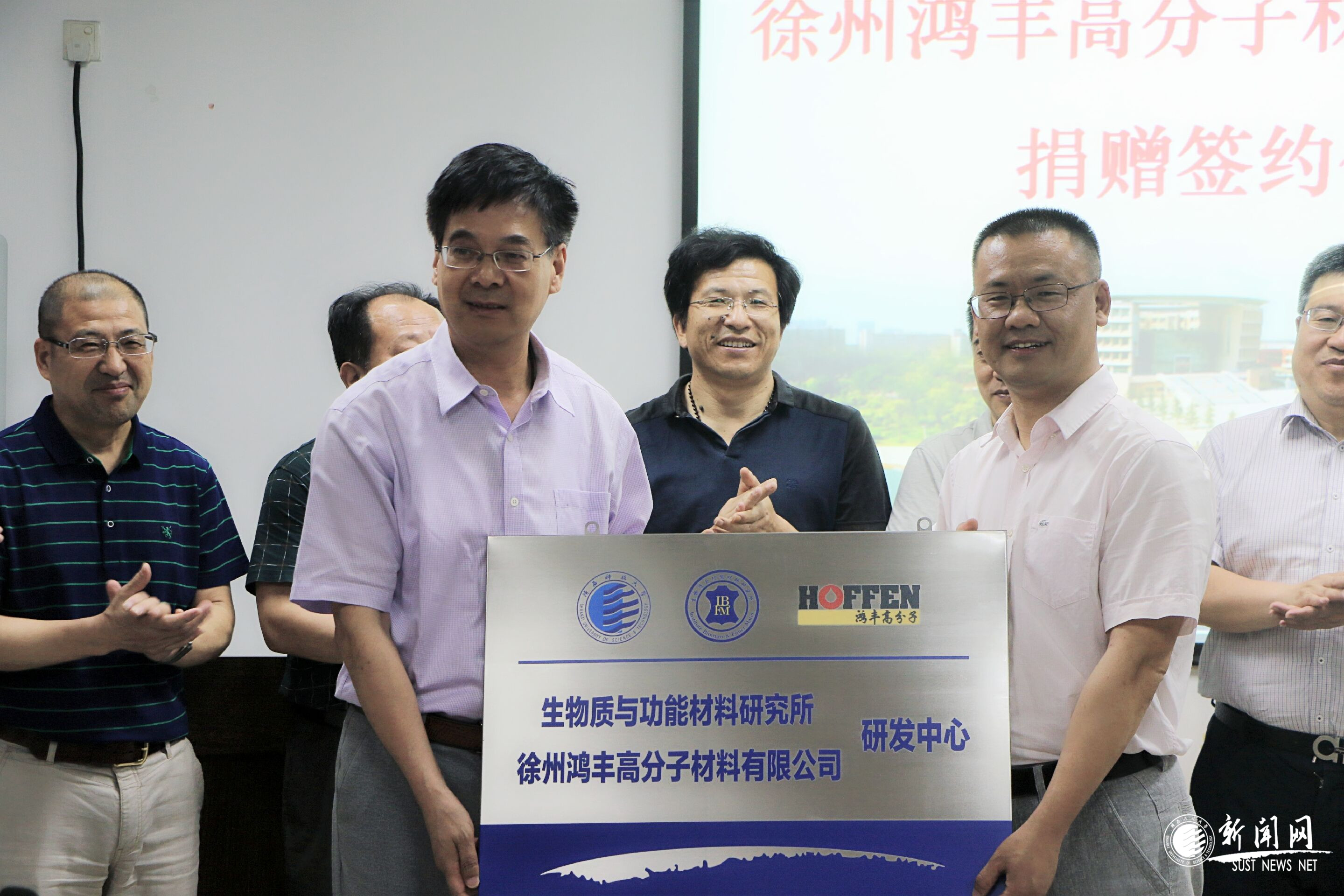在随后的捐赠签约仪式上,徐州鸿丰高分子材料有限公司向万象城官网捐赠了50万元,用于共建实验室建设和学生奖学金,并与allwincity万象城官方网站生物质与功能材料研究所签订了双方共建“生物质与功能材料研究所/徐州鸿丰高分子材料有限公司—研发中心”协议。