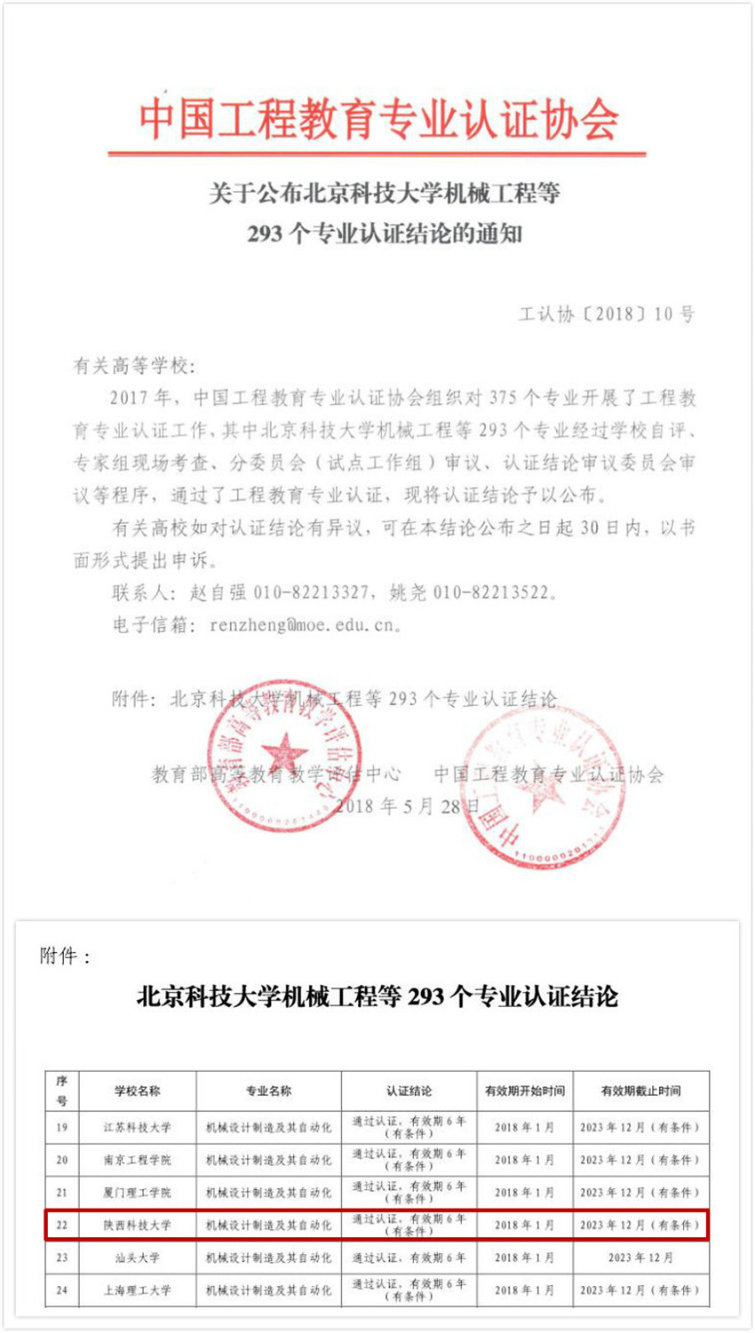 近日,教育部高等教育教学评估中心和中国工程教育专业认证协会联合发布了《关于公布北京科技大学机械工程等293个专业认证结论的通知》(工认协〔2018〕10号),公布了2017年参加全国工程教育专业认证的认证结论,经过学校自评、专家组现场考查、分委员会(试点工作组)审议、认证结论审议委员会审议等程序,全国高校共有293个专业通过认证。万象城官网机械设计制造及其自动化专业名列其中,顺利通过中国工程教育专业认证,有效期为6年(有条件),即2018年1月至2023年12月。此前,机械设计制造及其自动化专业于2017年11月6日至8日接受了工程教育专业认证专家组现场考查。至此,万象城官网已有包括无机非金属材料工程、食品科学与工程、化学工程与工艺、机械设计制造及其自动化在内的四个专业通过工程教育专业认证。