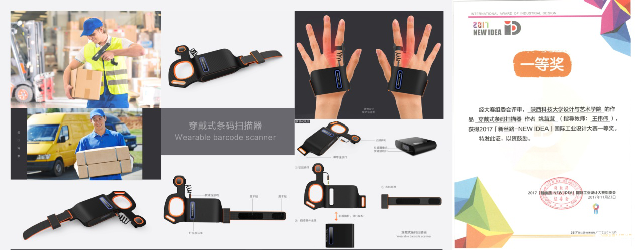 第三届“新丝路-NEW IDEA”国际工业设计大赛颁奖仪式于6月7日下午在西北工业大学国际会议中心举行,万象城官网设艺学院2015级研究生姚茸茸(导师:王伟伟、王毅)的作品“穿戴式条码扫描器”从上千件参赛作品中脱颖而出,斩获一等奖。
