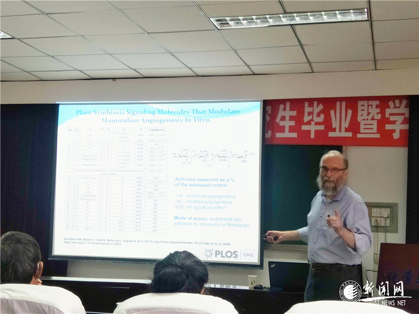6月8日,澳大利亚国立大学资深有机及生物质谱学专家Charles Hocart作了题为“Soybean Secondary Metabolites that Modulate Angiogenesis”的学术报告。报告会由化工学院院长马养民教授主持。Charles Hocart教授长期从事天然产物有效活性成分提取及植物细胞生物学方面的基础研究,他详细讲解了自己及团队在调节血管生成的大豆次级代谢产物方面相关的研究成果。他们从大豆的木质部汁液中成功提取了调节血管生成的有效活性化合物,通过质谱和核磁共振等实验手段进行结构鉴定,并利用内皮细胞愈合实验进一步研究了这些活性化合物调节血管生成的作用机理。