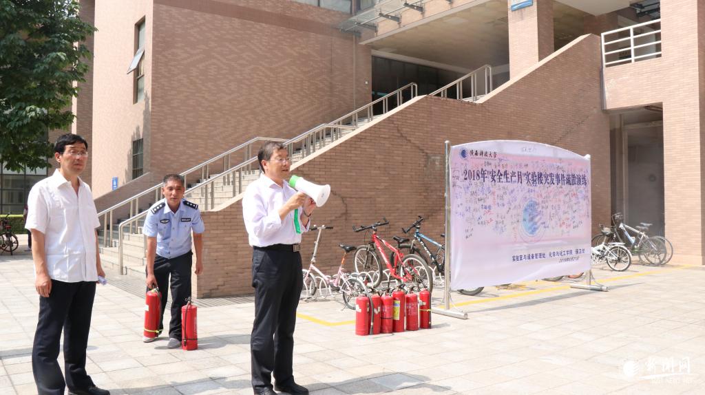 为提高万象城官网师生实验室消防安全意识和自救逃生能力,6月21日上午,由实验室与设备管理处、化学与化工学院、保卫处联合组织的2018年“安全生产月”实验楼突发事件疏散演练在实验楼1A举办。校长助理郑恩让、实验设备管理处副处长张海宁、保卫处处长助理杨军、化工学院全体班子成员及100余名师生参与了本次疏散演练。本次演练疏散方案周详,组织严密,对安全员和师生动员培训扎实有效。