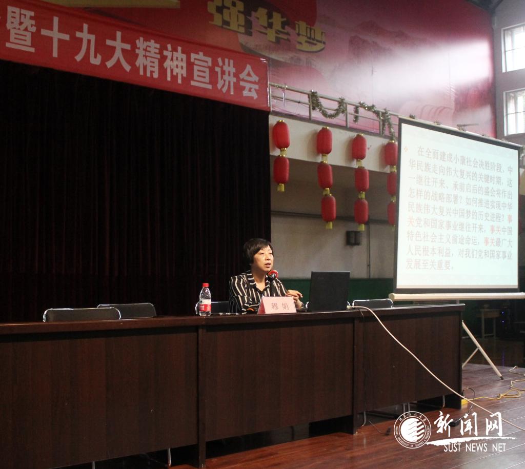 在表彰仪式后,咸阳市党的十九大精神专家宣讲团成员,陕西省党校系统优秀教师,中共咸阳市委党校党史党建教研室主任穆娟教授为全体党员干部教师作了题为“面向新时代的政治宣言和行动纲领——学习领会党的十九大精神”的专题宣讲报告。穆娟教授紧扣党的十九大报告,从充分认识党的十九大的重大意义、全面准确学习领会党的十九大精神、以高度政治自觉贯彻落实好十九大精神三个大的方面对党的十九大精神进行了的解读。