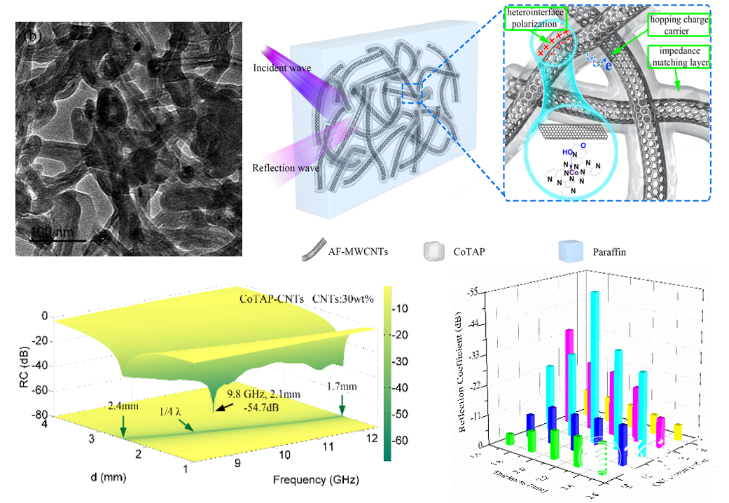 孔硌副教授是材料学院2015年引进的高水平博士,在《Journal of Materials Chemistry C》(SCI一区,IF=5.976)上发表研究工作。该工作在CNTs表面附载酞菁衍生物(CoTAP)构筑阻抗匹配层得到CoTAP-CNTs复合材料,通过低损耗CoTAP附载在CNTs表面构造异质界面,通过界面极化增强材料的吸波性能;低电导率CoTAP阻抗层减小了CNTs间的接触电阻,进而消弱了CNTs对电磁波的直接反射,该材料在X波段具有对电磁波低反射、强吸收的特点。