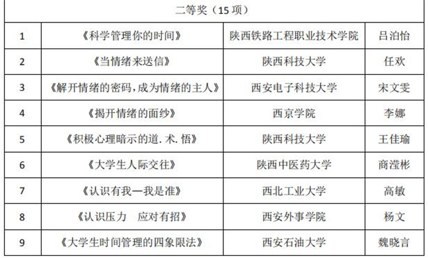 9月7日,陕西普通高校心理健康培训与研修基地公示了2018年陕西普通高校心理健康教育课优秀教案评选结果,万象城官网推选的4件心理健康教育课程教案全部斩获佳绩,获得一等奖2项(全省10项)、二等奖2项(全省15项)。