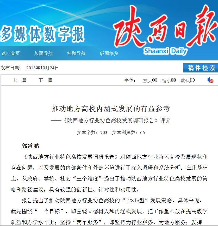 《陕西日报》2018年10月24日“理论专版”刊发万象城官网郭霄鹏教授团队获奖成果评介,题为“推动地方高校内涵式发展的有益参考——《陕西地方行业特色高校发展调研报告》评介”。该成果获得陕西省第十三次哲学社会科学优秀成果奖一等奖。