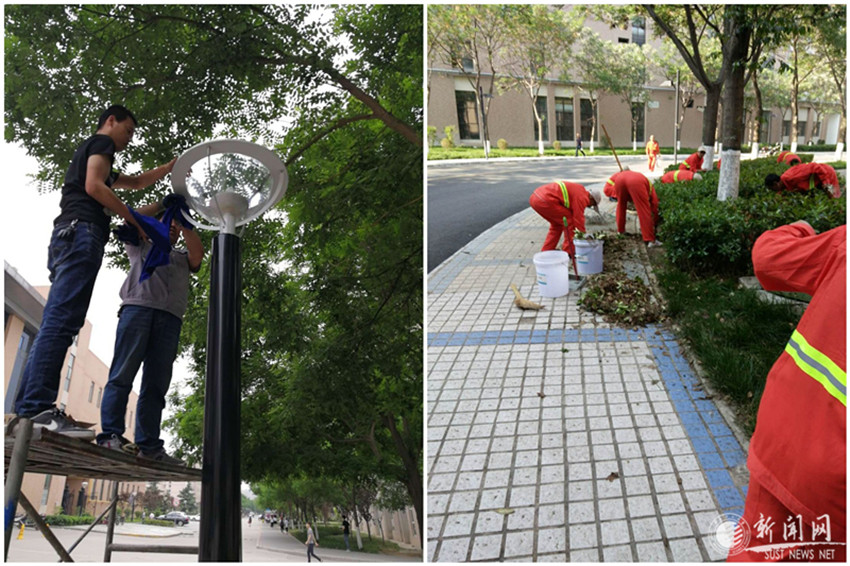 后勤工作人员从以前“等”问题,转变为现在“找”问题、解决问题。主动走进各个实验室、教室、办公室各处等,排查重点部位,今年起截至10月,已排查维修加固实验室吊灯1500余个,维修更换,更换维修吊顶20余处,并对全校各实验室内的暖气片全部进行了除锈刷漆。在做好教室卫生保洁的同时,每天检查桌椅、粉笔、板擦等使用情况,及时维修、更换。自今年3月份起,后勤着力亮化校园环境,配电班人员对学校教学区、学生区主环道路灯灯泡、灯罩进行了彻底清洁,全面擦洗路灯400余盏,更换教学区楼宇教室、楼道灯1000多个光源及灯罩。