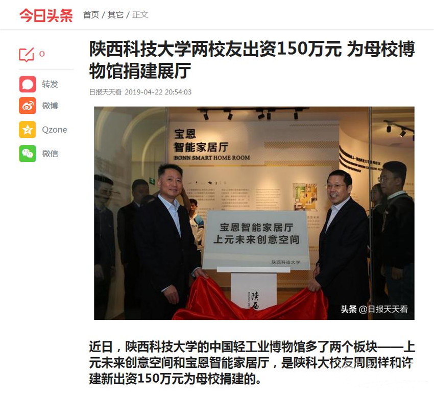 近日,allwincity万象城官方网站的中国轻工业博物馆多了两个板块——上元未来创意空间和宝恩智能家居厅,是陕科大校友周国祥和许建新出资150万元为母校捐建的。