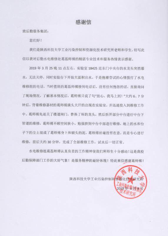 4月9日,学校工业污染控制和资源化技术研究所老师和学生联名给后勤集团写去感谢信,感谢后勤水电维修班葛磊师傅抢修及时,修理高效,表示衷心感谢,感谢后勤集团为牢记使命服务师生至上的宗旨。