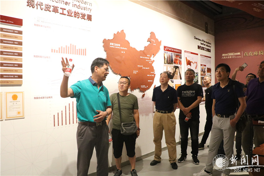王学川向校友们介绍皮革展厅中的部分展品