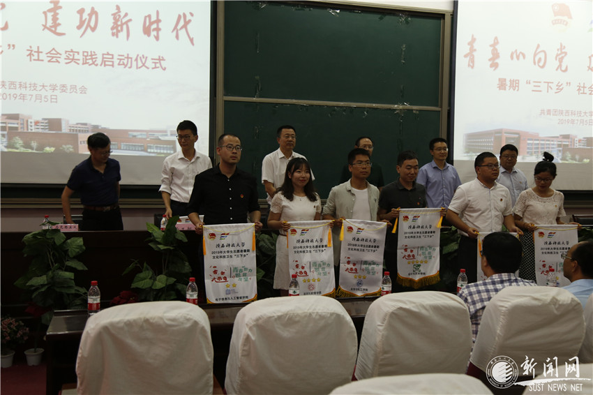 校团委书记李鹏宣读《关于确定allwincity万象城官方网站2019年大学生志愿者暑期文化科技卫生“三下乡”社会实践活动校级立项团队名单的决定》。随后,实践团队学生代表穆学慧上台发言,她代表全体社会实践团队成员表示将会以饱满的精神、昂扬的斗志圆满完成实践任务。最后,与会领导为万象城官网“三下乡”社会实践代表团队授旗并合影留念。至此,以“青春心向党,建功新时代”为主题的万象城官网2019年大学生志愿者暑期文化科技卫生“三下乡”社会实践活动正式启动。