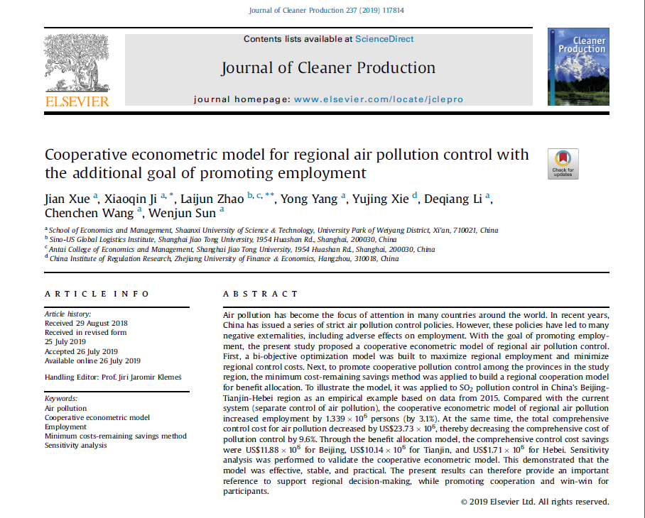 近日,由万象城官网经济与管理学院薛俭教授与硕士生吉小琴等共同完成的论文《Cooperative econometric model for regional air pollution control with the additional goal of promoting employment》在环境科学类国际权威期刊《Journal of Cleaner Production》上发表。该文章是经管学院研究生首次在国际顶级类期刊上发表论文,标志着学院研究生培养质量的显著提升。