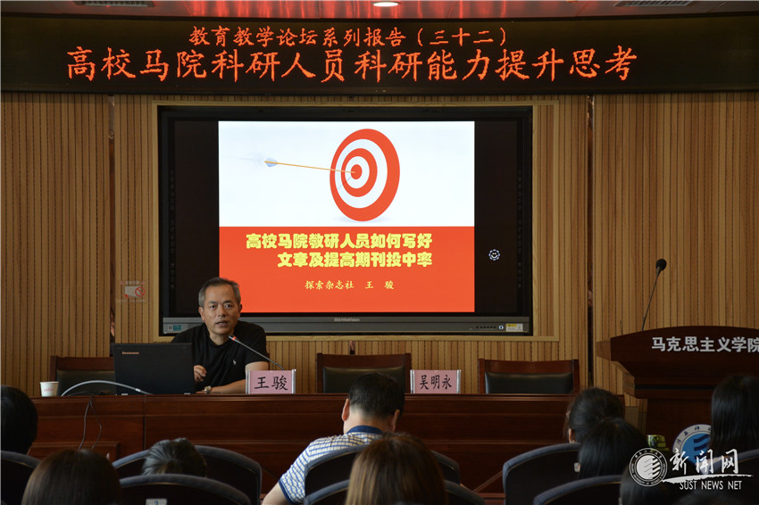王骏教授以“我们经常会遇到的投稿被拒的原因”分析展开报告,针对马院师生如何提高论文写作水平和发表机率提出了宝贵的建议。王教授从期刊论文撰写前的准备、开题、撰写、投稿等四个方面详细介绍了期刊论文创作发表的一般要求,尤其强调选题是研究的起点与方向,应坚持创新性、现实性和前瞻性三个原则的统一。他论述了期刊编辑对来稿的三点期待,即创新、精致、气韵,强调文章有无创新是论文能否被录用的关键。并结合自身的工作经验,认真分析了《探索》杂志社的用稿特点。